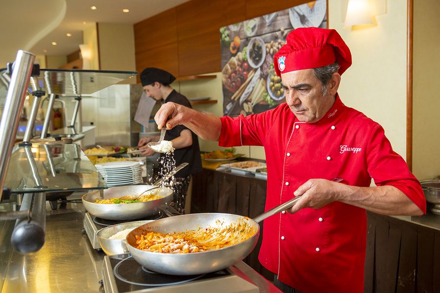 L’ampia sala ristorante fronte mare vi darà la possibilità di godere della nostra cucina in un ambiente fresco, ampio e luminoso. I nostri Chef offrono un curato servizio di Front Cooking , un vera delizia per occhi e palato dove potrete sempre trovare un ricchissimo buffet di verdure, antipasti caldi e freddi, primi e secondi piatti di carne e pesce, dolci sfiziosi e un mare di gelato. Prepariamo ogni giorno, oltre ai tipici piatti della nostra tradizione romagnola, anche tantissime ricette della cucina nazionale ed internazionale. Per i bimbi ci sono i Baby Menu realizzati dallo Chef - Patatine Smile - Hamburger di Pollo e Tacchino -Crocchette di Pollo e Nuggets -Würstel e Patatine Fritte.